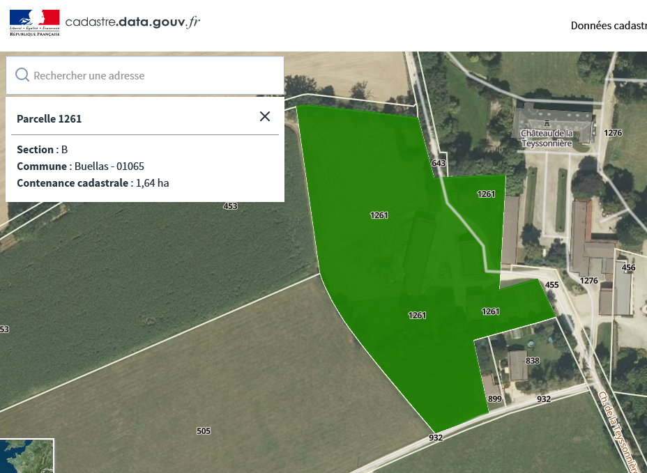 On peut compléter la recherche par d'autres sites internet tels https://www.parcelle-cadastrale.fr en spécifiant la section puis le numéro de la parcelle. Pour obtenir la section, dézoomer un peu sur géoportail :